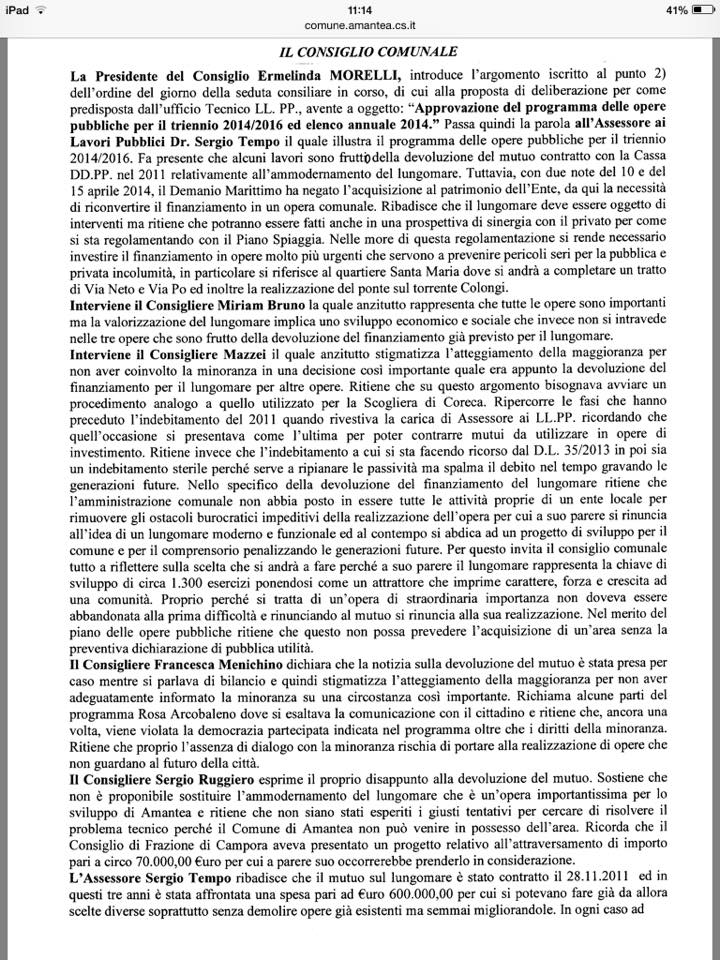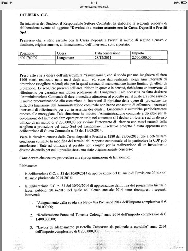 Proprio in quel consiglio comunale si è deciso di devolvere il mutuo di 2.5 milioni di euro contratto nel 2011 per il rifacimento del lungomare di Amantea in favore di altre opere.