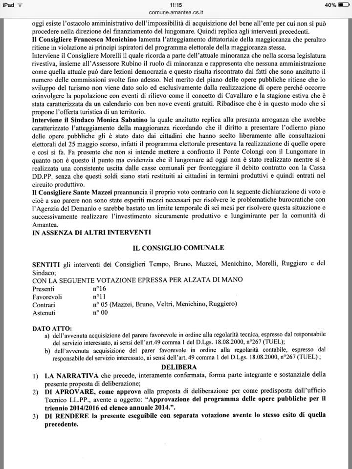 E' giusto che oggi un consigliere che abbia fornito l'indirizzo alla giunta di operare su quelle motivazioni oggi scopra leggendo la delibera che in realtà il mutuo viene devoluto perché il lungomare non è abbastanza protetto dalle mareggiate?